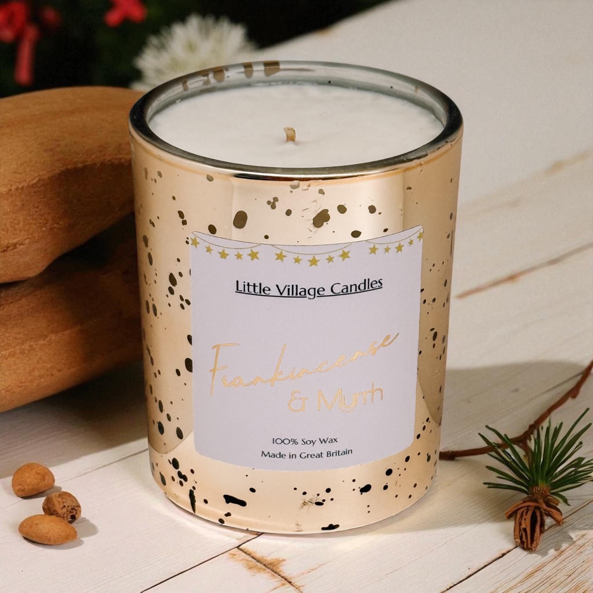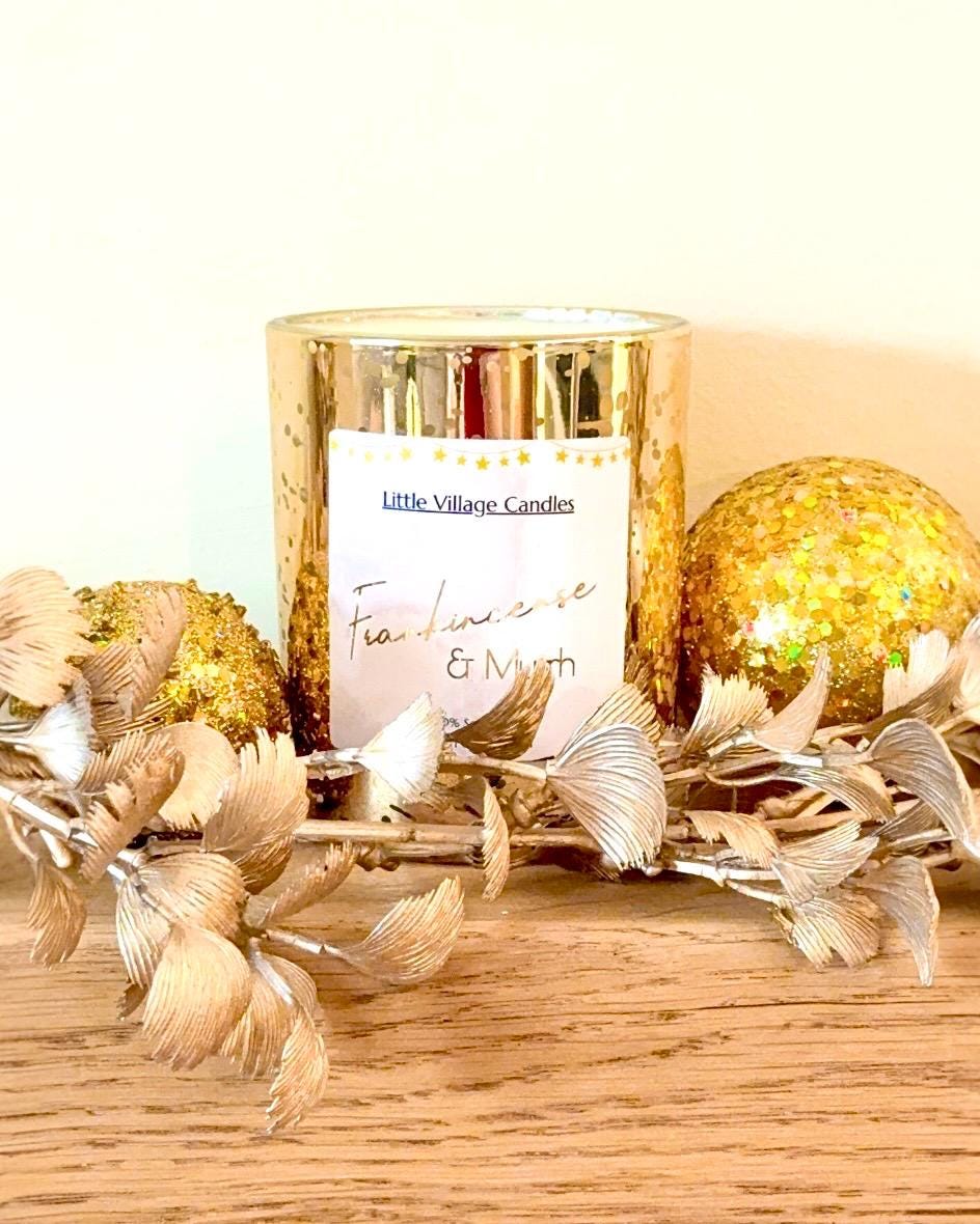 Step into a realm of gilded elegance with our Frankincense & Myrrh Christmas Candle – a timeless fragrance that captures the magic and grandeur of the festive season.