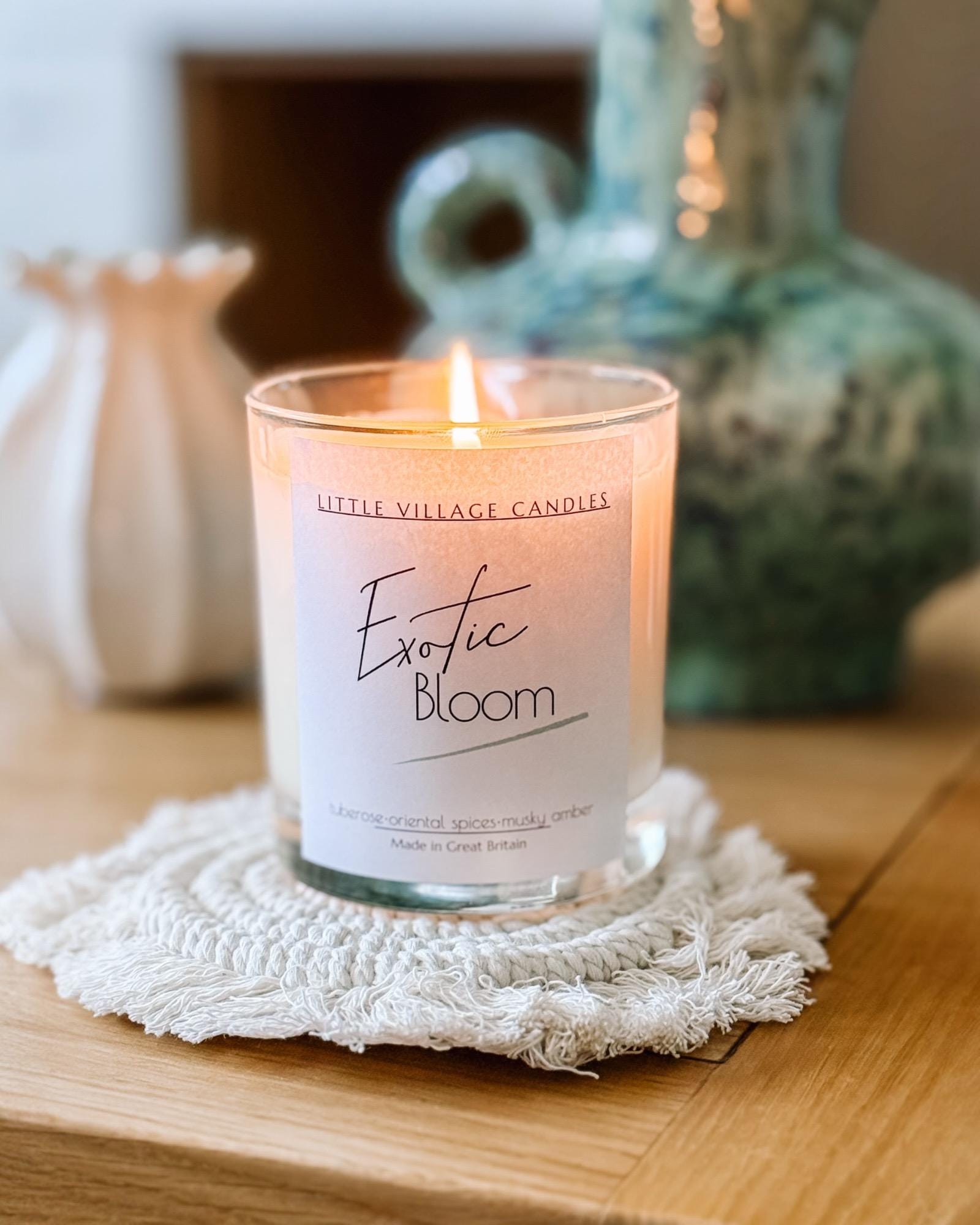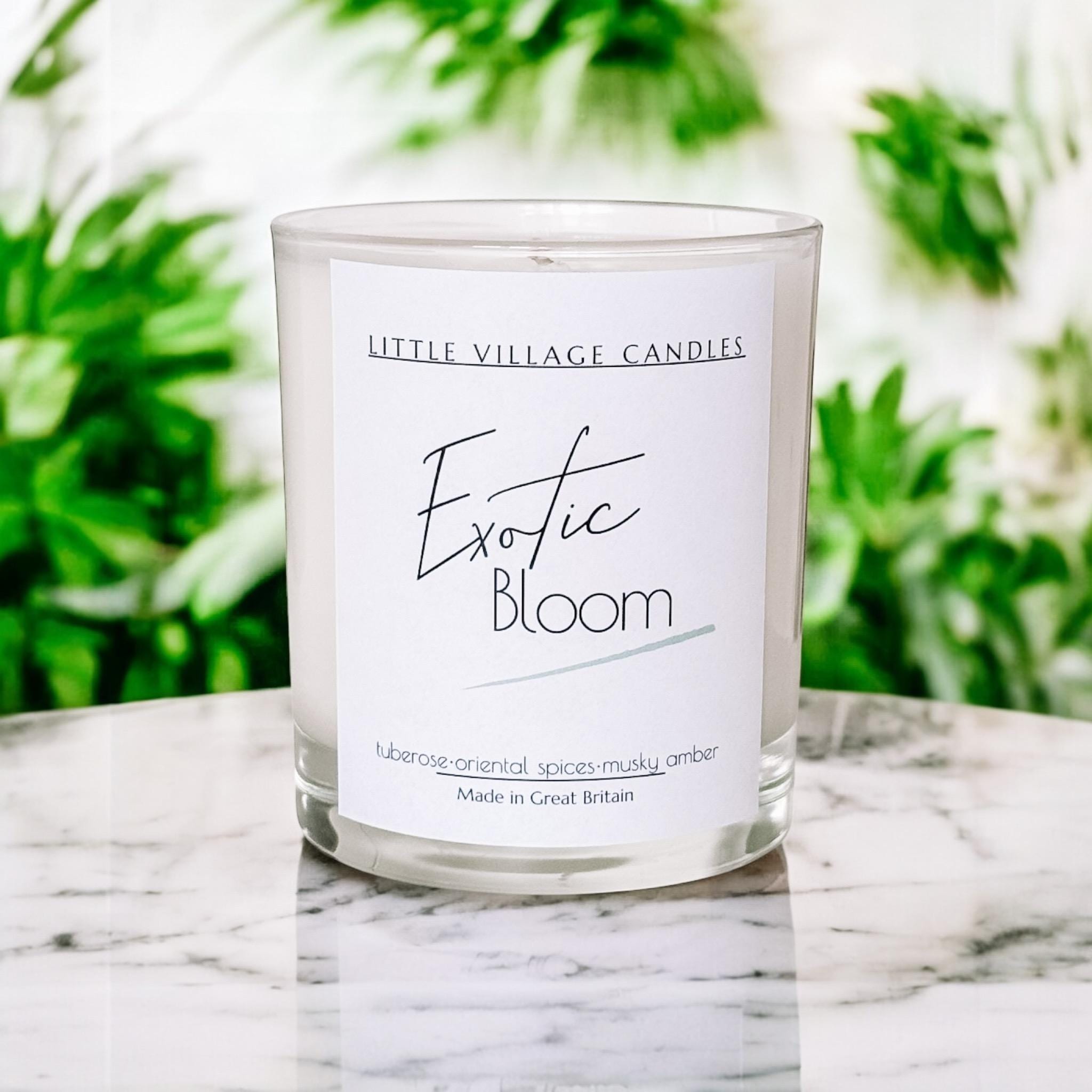 Indulge your senses with Exotic Bloom, a NEW floral scented candle from Little Village Candles. This luxury candle opens with a bold blend of tuberose and jasmine, followed by juicy red fruits and warming oriental spices. A vibrant twist of sweet orange and fresh lime cuts through, leading into a rich base of Bulgarian rose and deep musky ambers.
